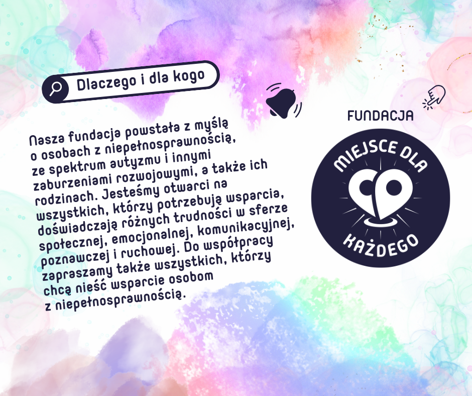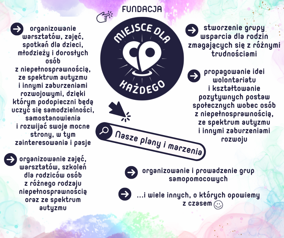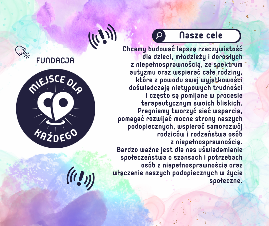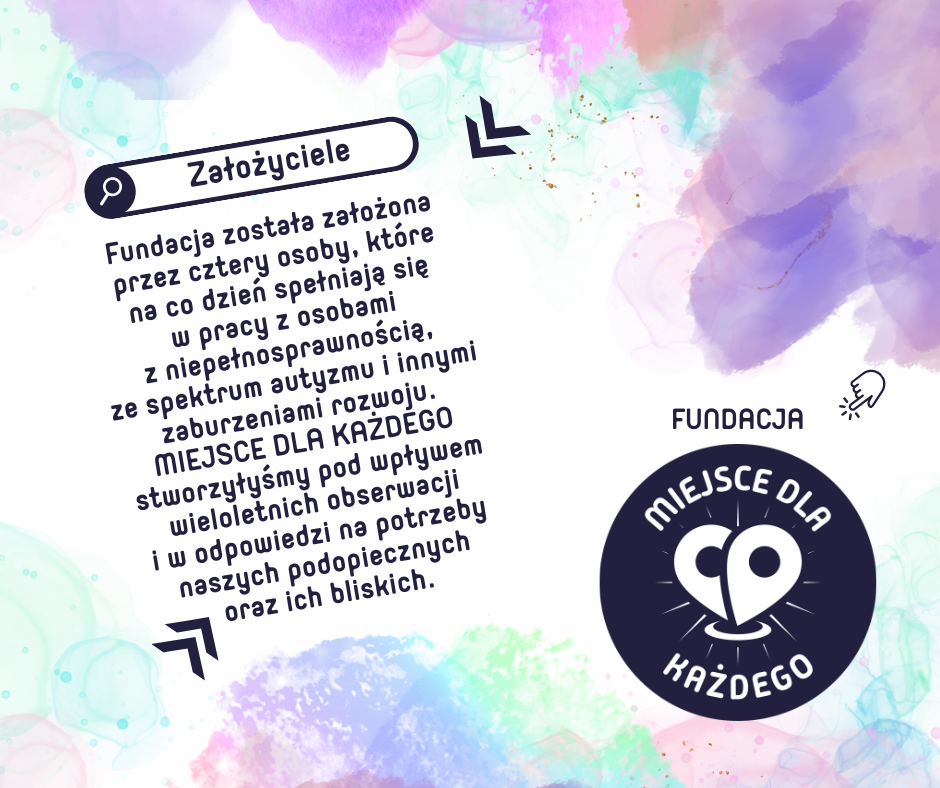 Fundacja powstała z potrzeby serca i wieloletnich doświadczeń w pracy z osobami z niepełnosprawnością, spektrum autyzmu oraz innymi zaburzeniami rozwoju. Założyły ją cztery osoby, które na co dzień wspierają dzieci, młodzież i dorosłych mierzących się z różnymi wyzwaniami. Naszym celem jest budowanie lepszej rzeczywistości dla osób z niepełnosprawnością oraz ich rodzin, które często doświadczają trudności i pozostają niezauważone w procesie terapeutycznym swoich bliskich.